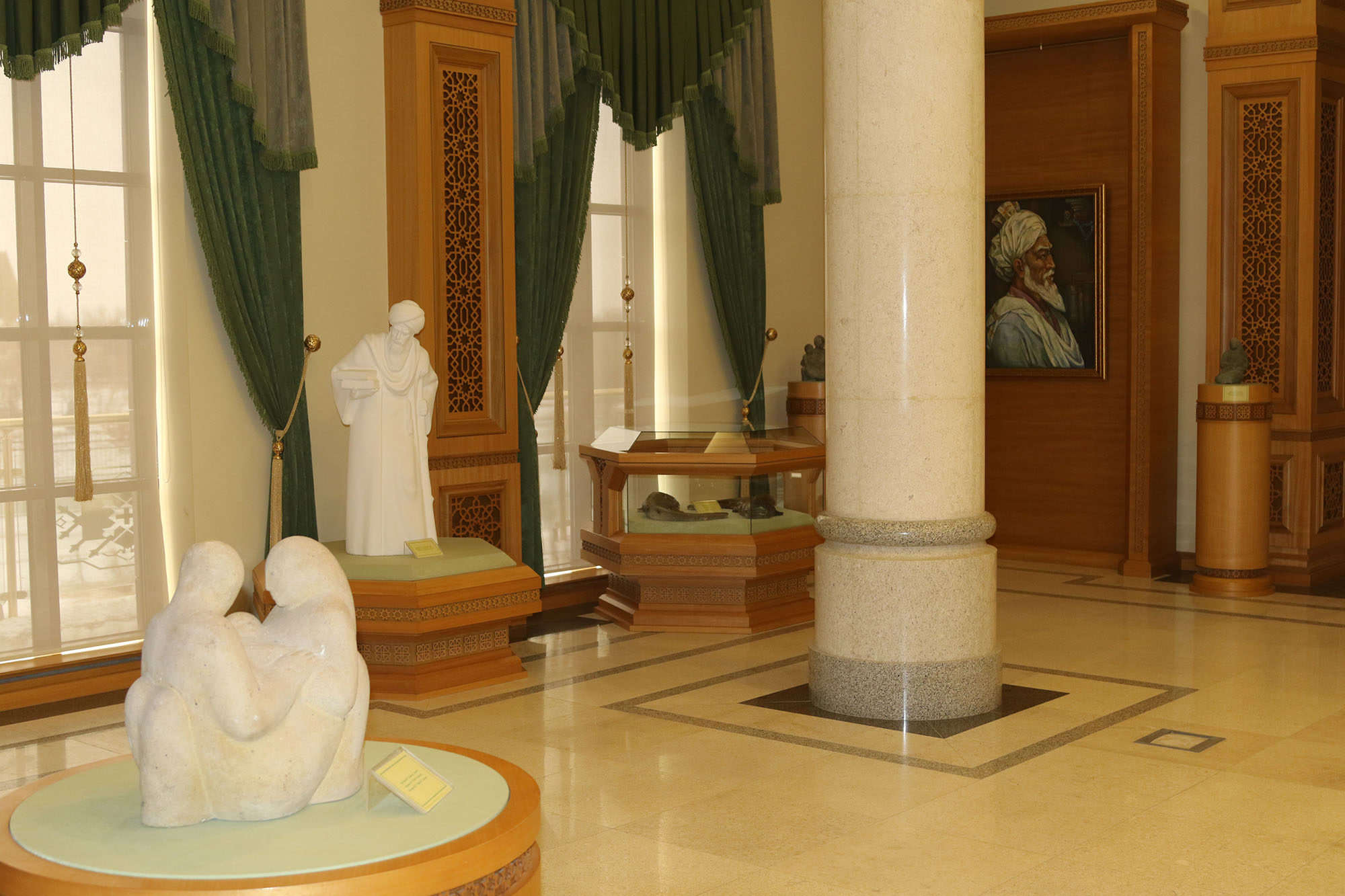 Now it became a task of modern artists to enrich section of fine arts. Our painters, who have passed creative development during the epoch of Revival, produced works showing achievements of our country and spiritual world of people. In exposition are shown works of well-known artists H.Annacharyyev, D.Bayramov, S.Meredov, G.Guseynov, sculptores B,Annamyradov, S.Babayev and ceramist S.Mukhammedova.