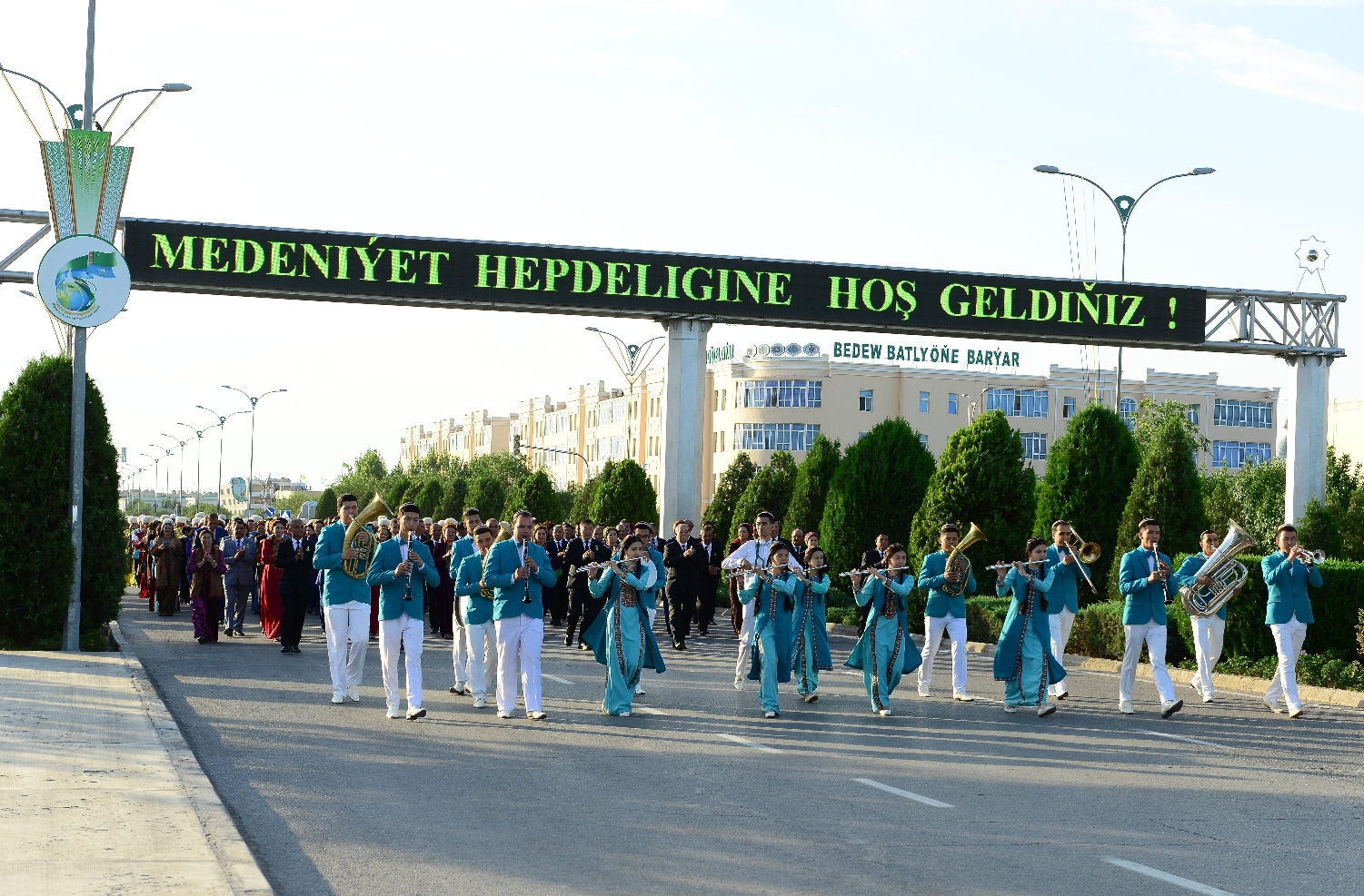 Köp öwüşginli meýdançada geçirilen baýramçylyk ýörişine belli teatr artistleri, estrada hem-de halk aýdymçylary, suratkeşler, şahyrlar, döredijilik toparlary, kitaphana işgärleri bilen birlikde muzeý işgärleri hem işjeň gatnaşdylar.